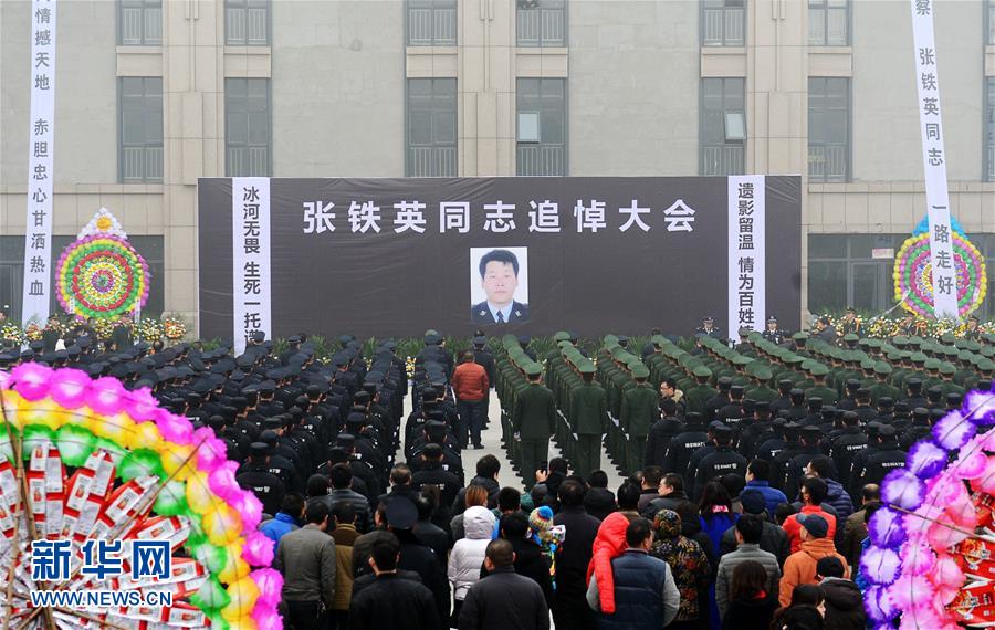 當(dāng)日,因營救河北白溝兩名落水群眾而犧牲的公安民警張鐵英同志追悼大會(huì)在河北白溝新城舉行。12月19日,河北省保定市白溝新城濱河公園北側(cè)白溝河內(nèi)有兩名群眾落水,白溝新城公安分局高橋派出所民警張鐵英接警后第一時(shí)間趕到現(xiàn)場(chǎng)救援,在救援過程中,張鐵英不幸落入冰窟。在生死關(guān)頭,張鐵英奮力將落水人員托出水面,兩名落水人員在接應(yīng)群眾的協(xié)助下成功獲救,而張鐵英因體力透支沉入冰河之中,英勇犧牲,享年42歲。新華社記者 朱旭東 攝