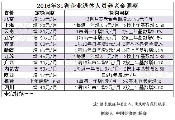 以云南為例,繳費(fèi)年限每滿一年每人每月增加2元,再按本人2015年12月基本養(yǎng)老金的2.5%增加調(diào)整。安徽規(guī)定,繳費(fèi)年限滿15年后滿一年每人每月增加3元,再按本人2015年12月基本養(yǎng)老金的1%增加調(diào)整。中國(guó)經(jīng)濟(jì)網(wǎng)統(tǒng)計(jì),已公布方案省份,大多以此進(jìn)行掛鉤調(diào)整。