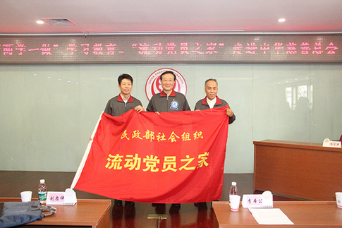 中華慈善總會會長兼“兩學(xué)一做”領(lǐng)導(dǎo)小組組長李本公(中)、民間組織服務(wù)中心黨委書記劉忠祥(右一)將民政部社會組織“流動黨員之家”旗幟交給中國社會工作聯(lián)合會。