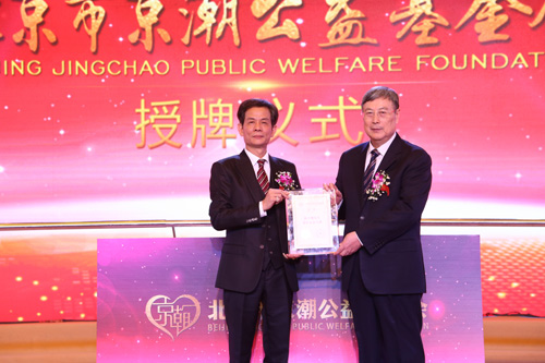 第十一屆全國(guó)政協(xié)副主席黃孟復(fù)為北京市京潮公益基金會(huì)主席、北京潮籍公益志愿者服務(wù)中心榮譽(yù)理事長(zhǎng)陳才雄授牌。