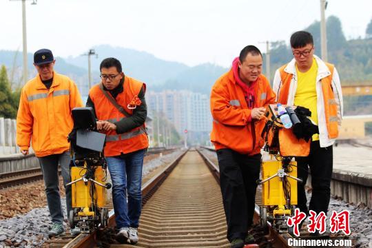 鐵路鋼軌探傷工被譽(yù)為診斷鋼軌傷損的“醫(yī)生”。歷經(jīng)十度春運(yùn)的鐵路鋼軌探傷工陳永良,再度站到鐵軌上開始探傷作業(yè),從漳龍線k124起至k113公里完成7.8公里的探傷作業(yè)!∴w倔林 攝