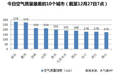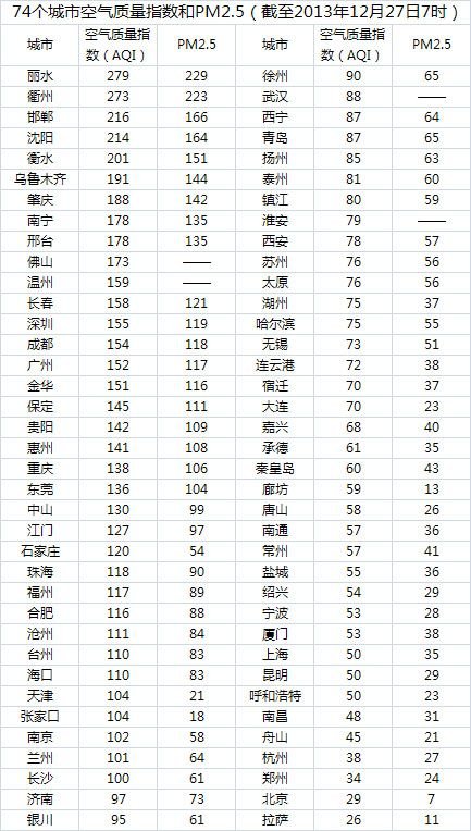 人民網(wǎng)北京12月27日電 (蔣琪)截至今天早上7時(shí),麗水的AQI(空氣質(zhì)量指數(shù))達(dá)到279,屬于重度污染,成為74個(gè)公布PM2.5數(shù)據(jù)城市中空氣質(zhì)量最差的城市。今日空氣質(zhì)量最差的10個(gè)城市分別是麗水、衢州、邯鄲、沈陽(yáng)、衡水、烏魯木齊、肇慶、南寧、邢臺(tái)、佛山,據(jù)統(tǒng)計(jì),今日?贏QI指數(shù)超過100,屬于輕度污染。