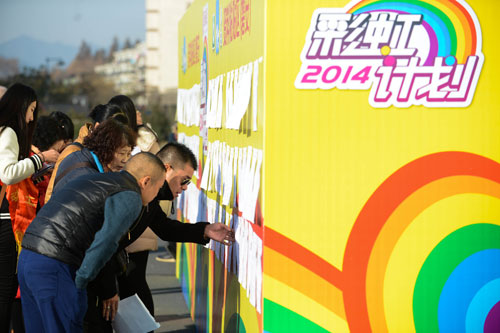 愛(ài)心人士在助學(xué)活動(dòng)現(xiàn)場(chǎng)查看貧困孩子的介紹資料。