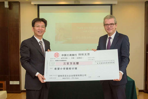 INDITEX主席、首席執(zhí)行官帕布羅·伊斯拉先生向團(tuán)中央書記處常務(wù)書記、中國(guó)青基會(huì)理事長(zhǎng)賀軍科遞交捐贈(zèng)牌,資助希望小學(xué)微校計(jì)劃。