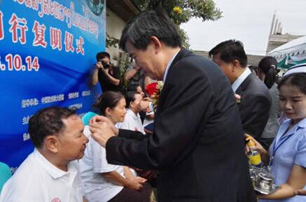 10月14日上午,中國(guó)駐老撾大使關(guān)華兵、中國(guó)公共外交協(xié)會(huì)副會(huì)長(zhǎng)龔建忠、中國(guó)慈善聯(lián)合會(huì)副秘書(shū)長(zhǎng)劉佑平、老撾國(guó)家衛(wèi)生部副部長(zhǎng)普屯·孟巴、老撾外交部經(jīng)濟(jì)司司長(zhǎng)兼瀾湄合作高官宋干、老撾國(guó)家衛(wèi)生部辦公室主任NaoBota等出席了“湄公河光明行”啟動(dòng)儀式,并上臺(tái)為患者代表揭眼罩。