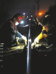 1月12日凌晨2點,滬蓉線1912+100km處,四周一片漆黑,氣溫接近零度!暗蔚蔚巍保⑷醯穆曇魪能壍肋厒鱽怼粋二十出頭的小伙子,蹲在軌道旁,手里一個探頭在鐵軌焊縫處來回移動著,眼睛直盯著旁邊發(fā)著規(guī)律聲響的探測儀器。