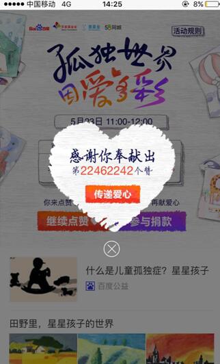 此次活動(dòng)由百度公司、百度公益基金會(huì)、壹基金、58同城聯(lián)手發(fā)起,聚焦自閉癥兒童通過(guò),AR技術(shù)和互聯(lián)網(wǎng)力量向全網(wǎng)用戶(hù)展現(xiàn)自閉癥兒童的才藝和相關(guān)常識(shí),網(wǎng)友點(diǎn)贊支持還可以積累配捐,用于孩子們接受“全納教育”和行為訓(xùn)練。