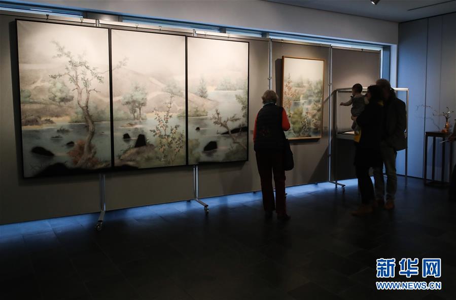 11月11日,在德國(guó)柏林中國(guó)文化中心,參觀者觀看展出的畫作。