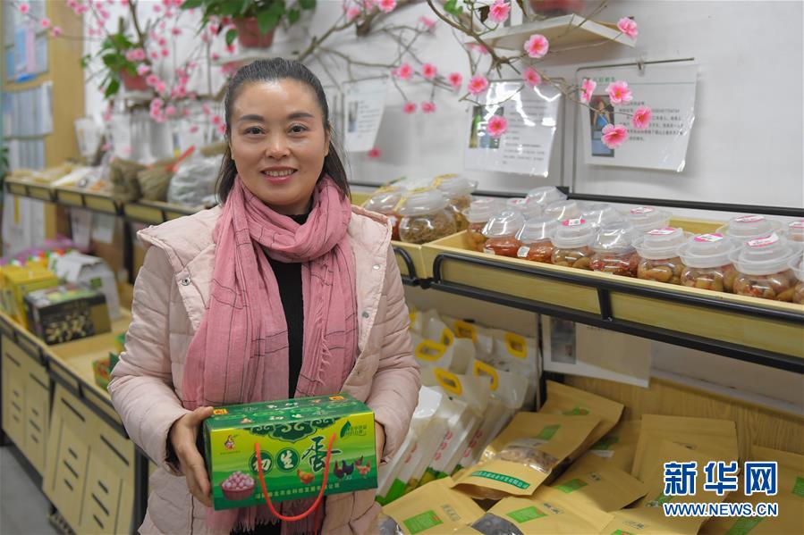 在位于長沙的“愛心雜貨鋪”內(nèi),趙媛在展示農(nóng)產(chǎn)品(11月13日攝)。