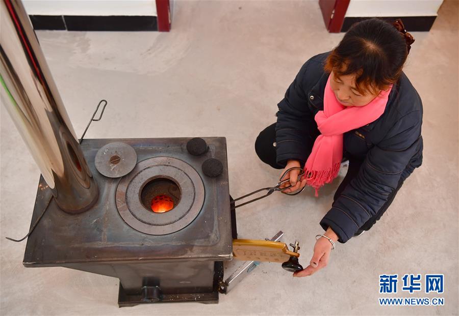 12月6日,在陜西省銅川市照金鎮(zhèn)芋園村五峰安置點,居民孔愛群向新型環(huán)保煤爐中添加潔凈型煤。