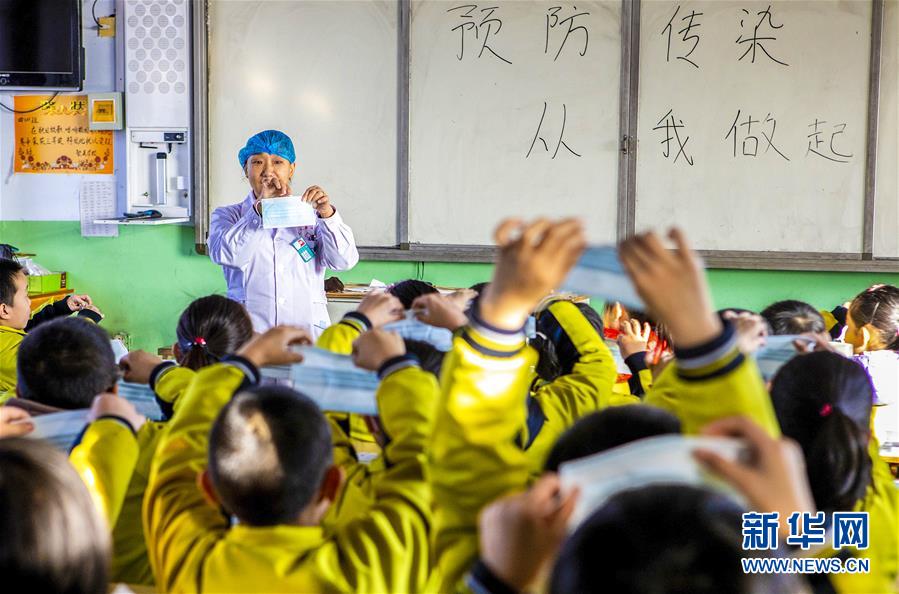 12月13日,武邑縣人民醫(yī)院的醫(yī)務(wù)人員向武邑縣聚英學(xué)校的學(xué)生演示口罩的正確佩戴方法。
