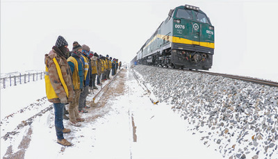 春運時節(jié)正值隆冬,平均海拔5000米的唐古拉山區(qū)風吹石頭跑、雪打如刀割,氧氣含量不到海平面的40%。為確;疖嚢踩ㄐ,上百名線路工、勞務工堅守在這里,頂狂風戰(zhàn)暴雪,排除凍土、大風、塌方等危害鐵路安全的險情,用血肉之軀鑄成一根根看不見的“軌枕”,托起青藏鐵路安全運行的奇跡。