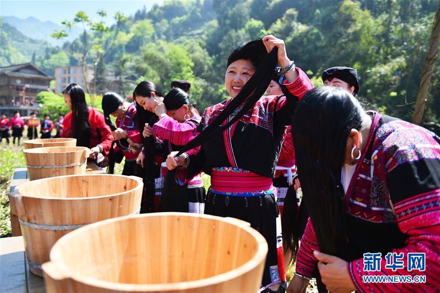4月7日,廣西龍勝黃洛瑤寨的瑤族群眾在戶外展示長發(fā)梳妝。