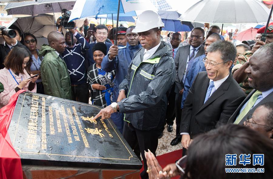4月17日,在贊比亞盧薩卡省瓊圭,贊比亞總統(tǒng)倫古(中)為玉米粉加工廠項目揭牌。
