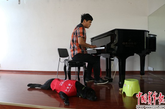 岳雷在家彈鋼琴時,導盲犬芬麗在一旁安靜陪伴。本組照片由中國青年報·中青在線記者 王海涵/攝