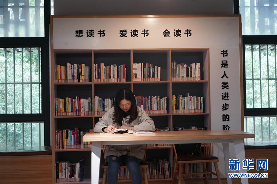 在南京市江寧區(qū)秣陵街道殷巷社區(qū)一處小區(qū)內(nèi)的睦鄰書房,一位女士在閱讀書籍(11月6日攝)。