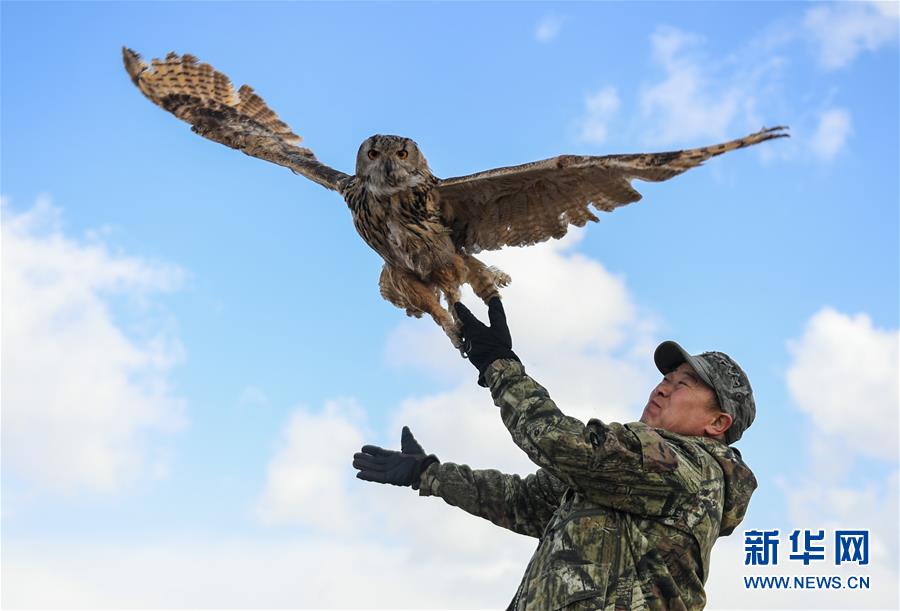 在呼倫湖畔,雙龍為救助的雕鸮做野外放生訓(xùn)練(4月13日攝)。