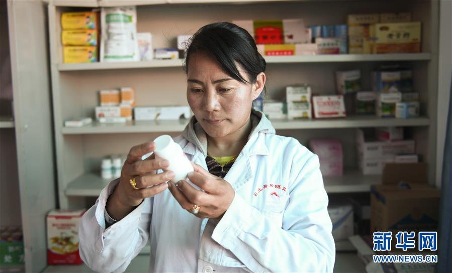嘎宗卓瑪在衛(wèi)生室檢查藥品(8月3日攝)。