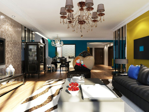 餐廳設(shè)計(jì): 餐廳利用大幅現(xiàn)代畫作為背景,融合于整個(gè)現(xiàn)代空間中。讓空間更加生動(dòng)自然。中和黑白調(diào)子帶來(lái)的生硬感。餐廳選用藍(lán)色墻面和客廳背景形成鮮明的色彩對(duì)比。并且通過黑白鏡面的反射產(chǎn)生更加多變靈動(dòng)的效果。