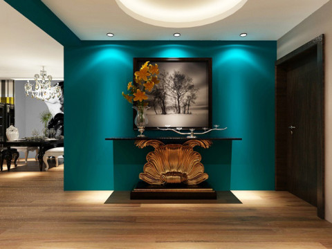 門廳設(shè)計(jì): 入戶門廳與廚房墻面形成獨(dú)立色塊,讓空間更加立體化。也充滿趣味性。藍(lán)色乳膠漆的大量運(yùn)用與黃色花的點(diǎn)綴凸顯了整個(gè)空間的現(xiàn)代氛圍。