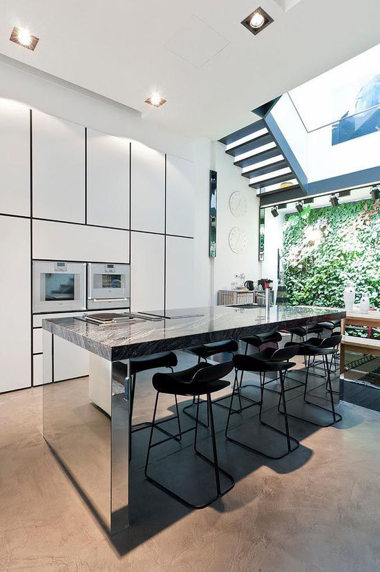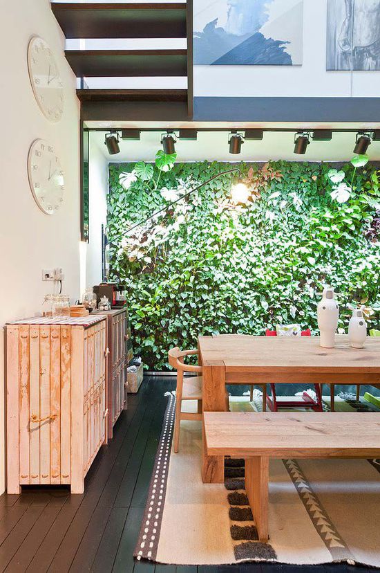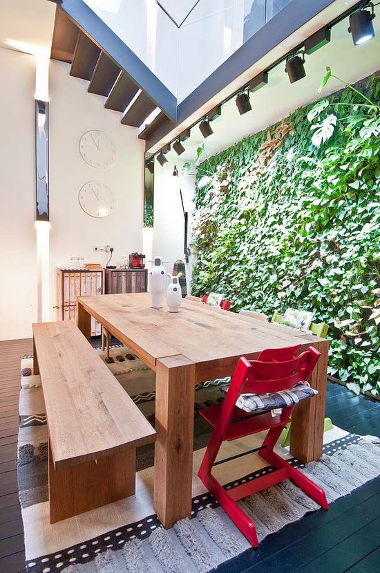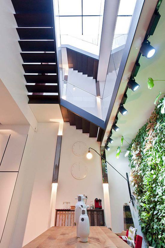 閣樓共分為上下兩層空間,一層空間的布置十分強(qiáng)大,首先給人的感覺便是通透、明亮、文藝范。拋光混凝土的地面、黑色鐵絲網(wǎng)的天花通風(fēng)口、黑色氧化鐵制成的樓梯(樓梯 裝修效果圖)等為空間又增添了工業(yè)風(fēng)格的氛圍,白色的磚墻墻面上色彩豐富的四位偉人油畫在射燈的照射下猶如畫廊般,具有很強(qiáng)的視覺沖擊力。閣樓的另一個(gè)設(shè)計(jì)亮點(diǎn)是植生墻在餐廳(餐廳裝修效果圖)空間墻面的運(yùn)用,植生墻在無視覺阻隔的一層空間營造了生機(jī)盎然的感覺,綠色且獨(dú)特。二層空間則為私密性很強(qiáng)的臥室(臥室裝修效果圖)和浴室,主臥的設(shè)計(jì)依舊是通透、寬敞,有酒店(酒店裝修效果圖)般的空間布局。