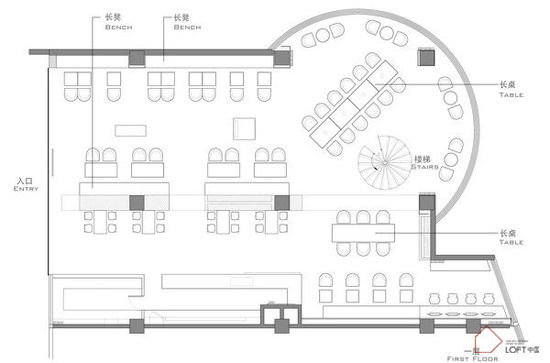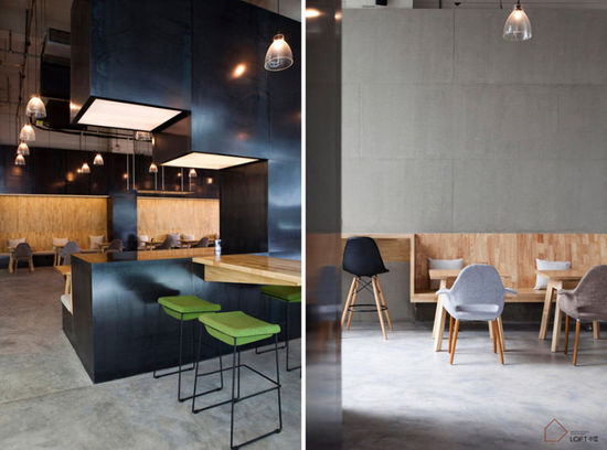 二樓為環(huán)形,利用照明采光,營(yíng)造出一個(gè)集中的開放空間,可以提供不同類型的活動(dòng)場(chǎng)地?梢苿(dòng)的墩狀圓柱咖啡桌沿圓形長(zhǎng)椅擺放,使用者可根據(jù)需要隨意移動(dòng)。設(shè)計(jì)完成的空間,超越提供咖啡和飲品的基本功能,成為一個(gè)公共活動(dòng)空間,使顧客感受到不同的情緒氛圍。