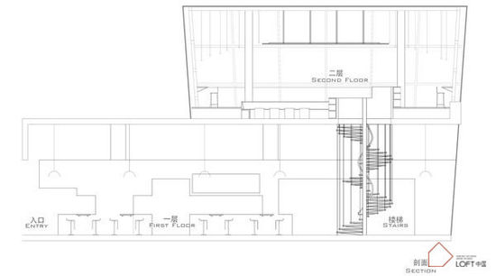 咖啡廳、餐館、圖書館(圖書館裝修效果圖)已日益成為我們生活中不可替代的空間,latitude studio在這個(gè)空間中,探索將傳統(tǒng)的咖啡廳功能與公共視覺藝術(shù)結(jié)合的可能?臻g分兩層,一樓通過去除玻璃外墻,形成一個(gè)擴(kuò)展的公共開放空間。其內(nèi)部包含兩個(gè)區(qū)域:快飲區(qū)(快)和休閑區(qū)(慢)?祜媴^(qū)選用高腳桌椅,臨近服務(wù)區(qū)——由白色玻璃包裹的縱向柜臺(tái);休閑區(qū)采用矮桌,長(zhǎng)椅緊貼墻壁。這兩個(gè)區(qū)域用一個(gè)縱向鋼制元素隔開,它包括鏡子和投影儀,打造出一種奇妙的視覺錯(cuò)覺。