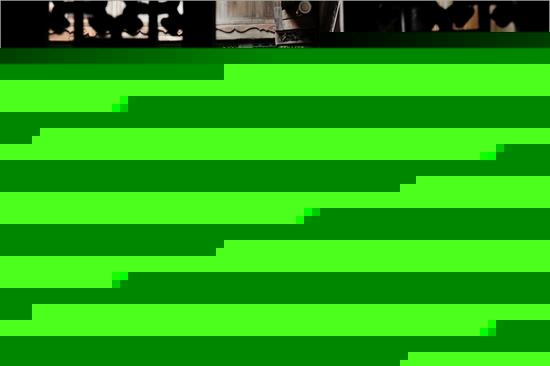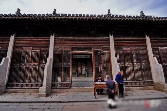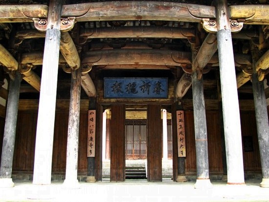 長春大社,它坐西朝東,臨近“氵眾”川河,面對豐山山脈,位于村南首端。社屋分門屋、正堂、后寢三部分。社屋門前有一偌大廣場,乃呈坎村民集會、演藝和祭祀的場所。欄門上方懸掛“長春大社”的藍(lán)底燙金直匾,系蘇東坡所書。大門呈五鳳樓制式。門屋正面為柵欄門,內(nèi)是中門和邊門。門屋五開間,正間最大,次間、稍間依次縮小,寓意“五鳳朝陽”,名曰“五鳳樓”。正堂高懸村民對土地企望的“春祈秋報”匾額,新置徽州名家黃澍先生書法“十雨五風(fēng)祈大有,四時八節(jié)慶豐收”;罩萆缥莸慕ㄖ攸c是如屋似廟,大都為平房,偶有呈兩進(jìn)起樓角的建筑,與普通民宅差異不大。社屋的下面為石庫門,門兩旁有圓形洞窗,稱之為“神眼”。另其選址在村若野,不像祠堂建在村中而建于村邊,大都與水口的溪、橋、亭、樹構(gòu)成水口景象。