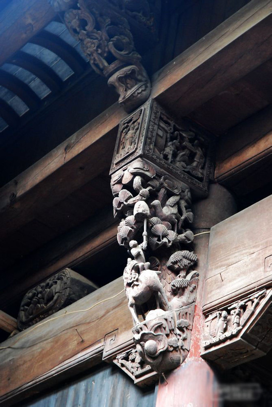 寶綸閣隱在最深的后院中,巍峨高聳恍如殿堂,寶綸閣是整個祠堂的精華部分,相傳主持續(xù)建此祠的羅應(yīng)鶴,明萬歷間曾任監(jiān)察御使和大理寺丞等職,深得明神宗龐信。羅“蓋之以閣用藏歷代恩綸”,故名“寶綸閣”,后來約定俗成地稱整座祠堂為“寶綸閣”三道臺階扶欄的望柱頭上的浮雕石獅。穹形的屋面和飛揚(yáng)的檐角,梁柱之間的盤斗云朵雕、鏤空的梁頭替木和童柱、荷花托木雕,令人眼花繚亂,而又美不勝收。臺階上十根面向內(nèi)凹成弧形的石柱屹立前沿,幾十根圓柱拱立其后,架起縱橫交錯的月梁。步出寶綸閣,透過欄桿看祠堂,依然回味著這座明代古建那巧妙的結(jié)構(gòu),精致的雕刻,絢麗的彩繪,久久難忘。