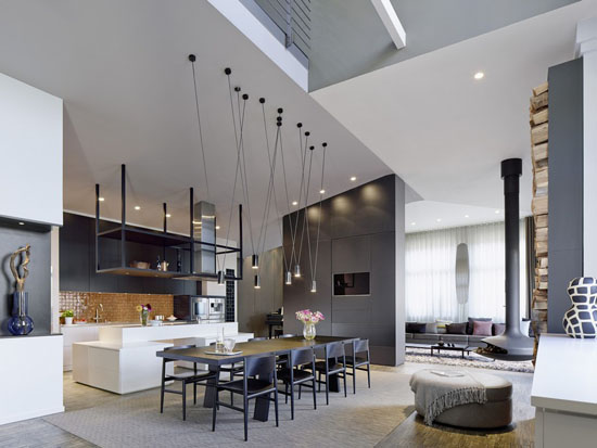 裝飾Tips:長(zhǎng)長(zhǎng)的吊燈給餐廳帶來(lái)很多優(yōu)雅的感覺(jué),白色的開(kāi)放式廚房干凈清爽,深淺搭配讓人眼前一亮。