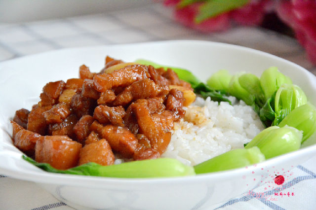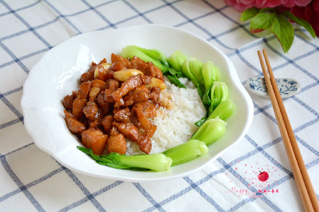肉爛且筋道,還有濃濃的肉汁;小油菜碧綠清淡,正好補充了維生素,還能中和一下肉的濃郁。白米飯舀上一大碗,稀里呼嚕的一大碗就進肚兒了。其實無非就是換了一種裝飯的方式, 吃起來卻噴香無比。