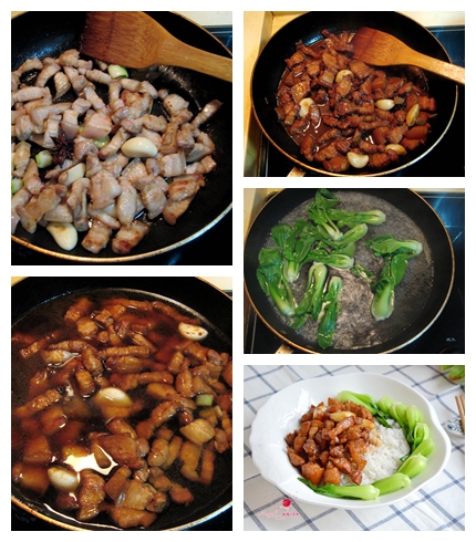 材料:帶皮五花肉500克,大蒜數(shù)瓣,大蔥一段,八角一顆,料酒少許,醬油50克,鹽少許,植物油少許,小油菜數(shù)棵,白米飯一碗