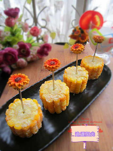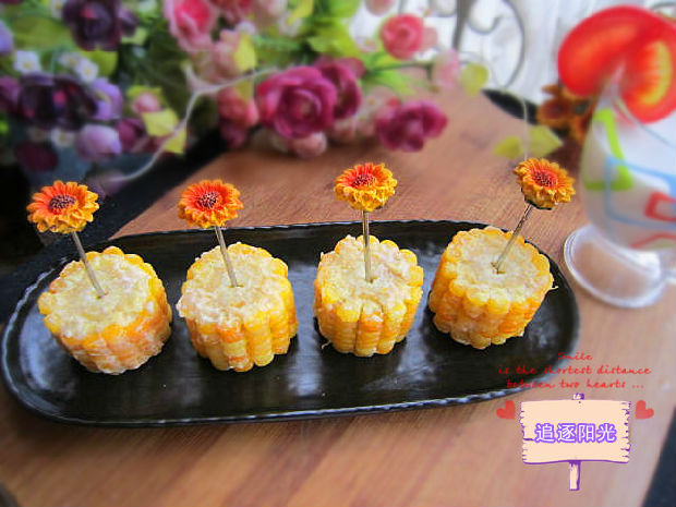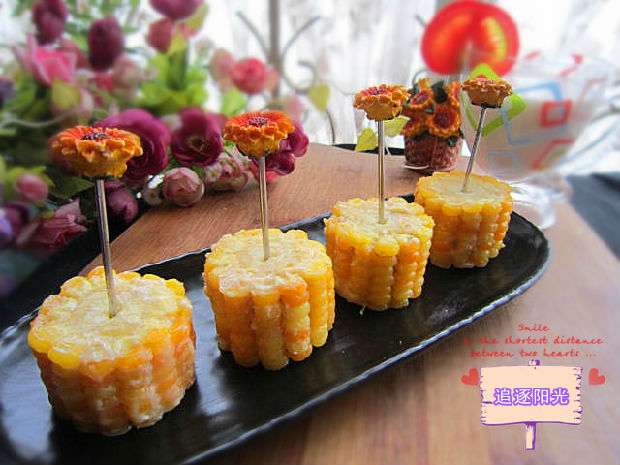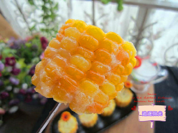 4,水快干時(shí)就轉(zhuǎn)小火,守在鍋邊,用筷子不停翻動(dòng)玉米段,直至汁液剛好收干,讓玉米段上都裹上一層油,關(guān)火。拿出來裝盤后,插上牙簽即可食用。