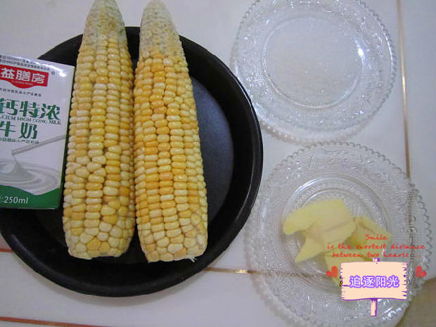 做法: 1,準(zhǔn)備好材料玉米2支 牛奶一袋,黃油35克,白糖15克