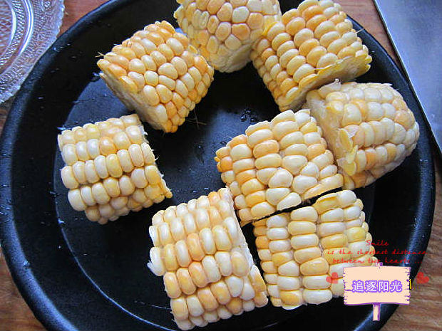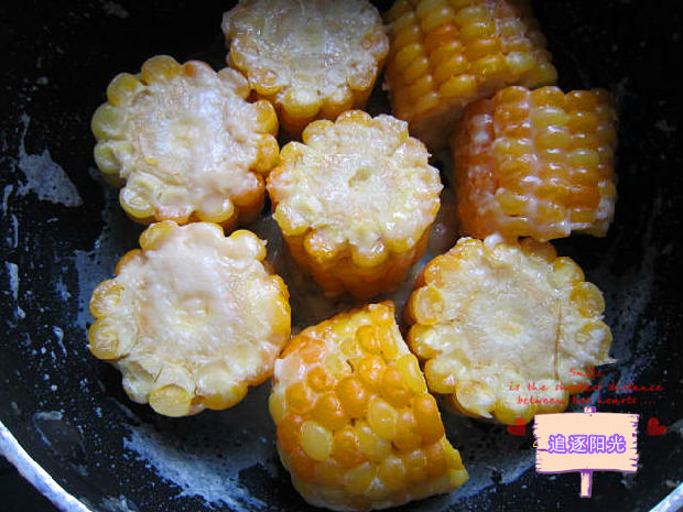 材料:玉米2支 牛奶一袋,黃油35克,白糖15克(多少可根據(jù)自己的口味來調(diào)整)
