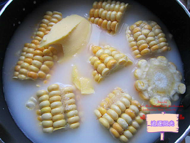 3、把玉米段排在湯鍋里,加牛奶剛好漫過玉米段(牛奶量不夠可以加點(diǎn)水),把黃油和白砂糖一起放入,水開后轉(zhuǎn)中小火煮半小時(shí)左右。