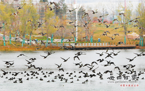 初冬的蘭州新區(qū)二號湖,迎來了一批尊貴的“客人”,連日來數(shù)千只候鳥在這里嬉戲飛翔。這些突然降臨的精靈,為秦王川增添了許多歡樂和活力。