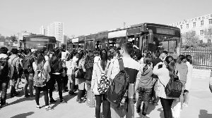 汽車(chē)南站公交車(chē)站乘客爭(zhēng)搶上車(chē)。 首席記者 張學(xué)江 攝