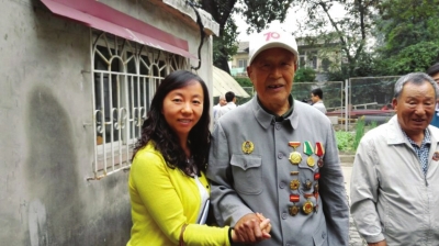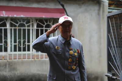 由于余老身體不是很好,原本約定只談40分鐘,但是很快一個小時就過去了。離別時,余老堅(jiān)持要送我們,并且特意換上了參加閱兵式的八路軍軍服。就這樣,余老從屋子里,一直送我們到院子里。在院子里,余老與大家合影留念。之后一一握手道別。等我們走出了院門,回頭再看時,余老站的筆直,敬了一個很標(biāo)準(zhǔn)的軍禮。那一刻,記者們在感動之余,瞬間將“長槍短炮”再次聚焦這位老人。