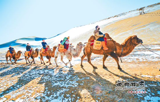 敦煌著名風景區(qū)鳴沙山·月牙泉雪后初霽、云蒸霞蔚,吸引了眾多游客和當?shù)厥忻袂巴p景游玩、拍照留念。本報通訊員王斌銀