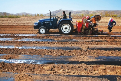 4月20日,定西市安定區(qū)香泉鎮(zhèn)農(nóng)民種植馬鈴薯。近年來,當?shù)赝ㄟ^主推馬鈴薯高產(chǎn)高效栽培技術模式,有效提高了馬鈴薯種植水平和單位面積產(chǎn)量。 本報通訊員陳永剛