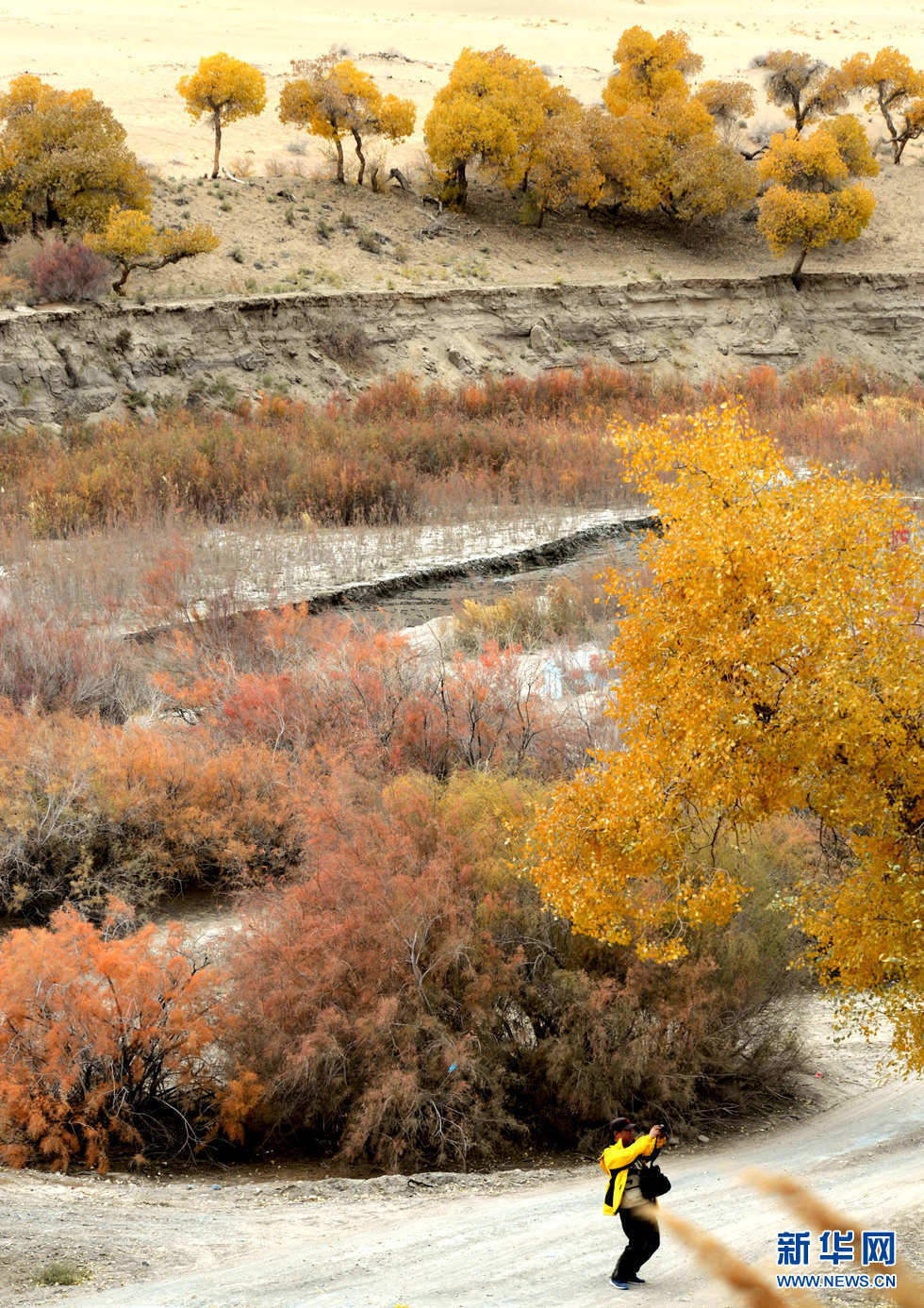 在甘肅省阿克塞哈薩克族自治縣多壩溝峽口,一位游客正在拍攝秋景(10月20日拍攝)。新華網(wǎng)發(fā) (梁強 攝)