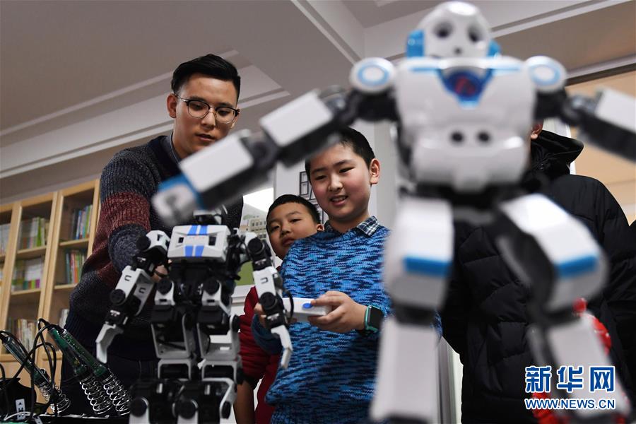 1月27日,孩子們在“寒假快樂課堂”老師的指導(dǎo)下操控機(jī)器人。新華社記者 陳斌 攝
