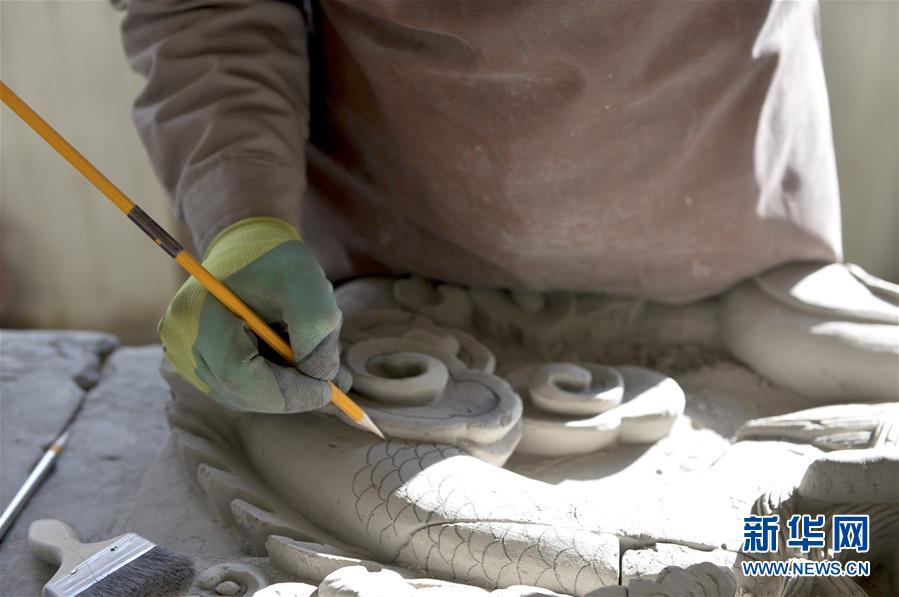 11月13日,在甘肅省臨夏回族自治州臨夏縣一家磚雕企業(yè),磚雕師在創(chuàng)作磚雕作品。新華社記者李笑 攝 -