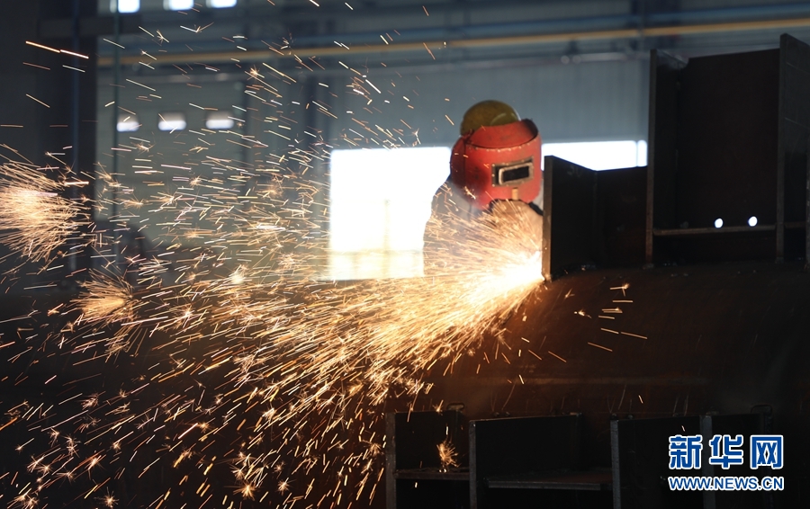 蘭州新區(qū)甘肅建投鋼結(jié)構(gòu)有限公司廠房內(nèi)焊花飛濺。新華網(wǎng)(王生元 攝)