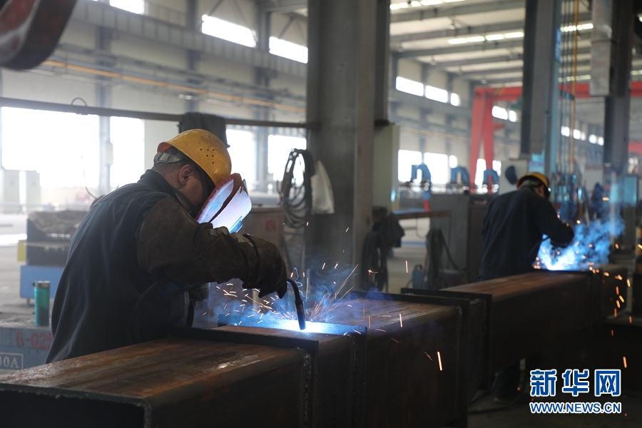 蘭州新區(qū)甘肅建投鋼結(jié)構(gòu)有限公司廠房內(nèi)工人在焊接鋼結(jié)構(gòu)產(chǎn)品。新華網(wǎng)發(fā)(童張偉 攝)