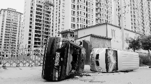 事發(fā)公司門(mén)口,被不明身份人員掀翻的兩輛車(chē)。 記者 馬成斌 攝