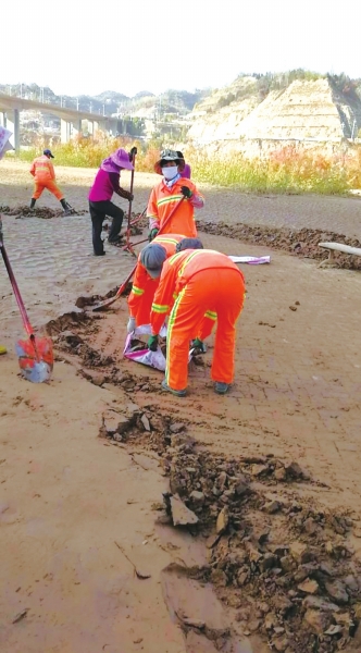 清運隊55名裝卸工以5人為一組,充分發(fā)揚“寧愿一人臟,換來萬人凈”的吃苦耐勞的奉獻精神,不怕臟,不怕累,有的揮鍬鏟地上的泥巴,有的利用小推車將清出的淤泥進行清理、轉(zhuǎn)運。