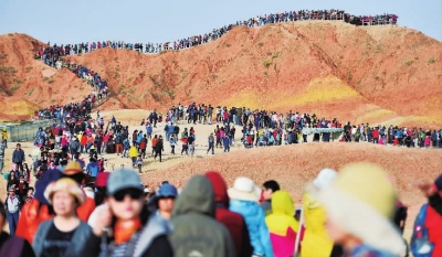 10月3日,張掖丹霞景區(qū)參觀者絡(luò)繹不絕。 新華社照片