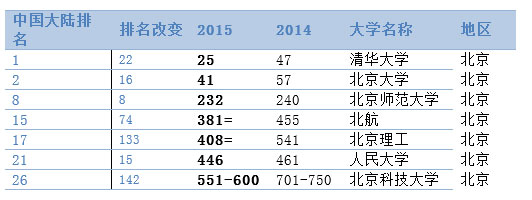 其中,北京7所:清華(25)、北大(41)、北師(232)、北航(381)、北京理工(408)、人民(446)、北京科技大學(xué)(551-600)。上海6所:復(fù)旦(51)、上海交通(70)、同濟(jì)(345)、上海大學(xué)(418)、華東理工(476)、華東師范(551-600)。